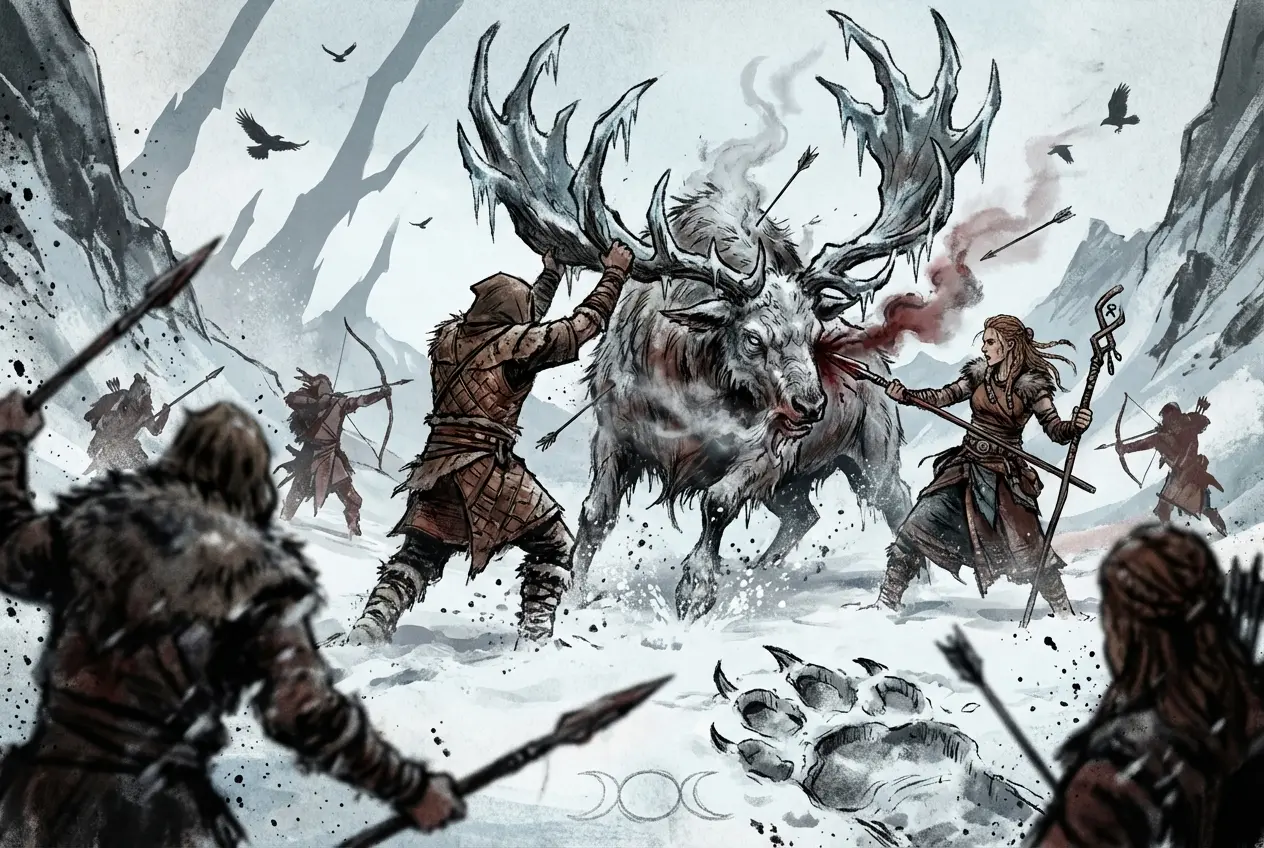 Then it came. Not like a crash, more like a heavy silence before the blow. The first Hrimkron emerged from the thicket, step by step, slowly, surely, with the majesty of something that does not realize it can die. Pieces of ice hung from his antlers like silver jewelry, and when he turned his head, they jingled. Haldor raised his hand, Jorund crouched, spears were drawn, bows were strung. Eirik held a spear in his hand and suddenly realized that his whole life had shrunk to that one point in space: the place where the weapon must strike so that the animal would not suffer and the people would survive. They gave the signal, and the world exploded into motion. Arrows whistled, spears flew, snow splattered under hooves. The animal lunged forward, the power of its neck like a hammer, and one of the Deer spears barely dodged; its antlers tore the fur on his shoulder, the blood immediately turning into a dark sheen on the white surface. Eirik ran, hearing only his own breath and the beating of his heart, and when he stabbed, he felt the resistance of flesh and tendons, he felt the spear go deep, the wood tremble, his frozen fingers slip on the shaft, because everything is slippery when life is mixed in.